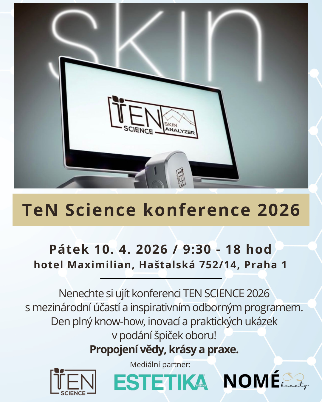 Podrobné informace o programu a registraci jsou k dispozici na oficiálních stránkách konference. https://www.nomebeauty.cz/ten-science-konference-2026/ Přístup je určen profesionálním kosmetičkám s platným ič.